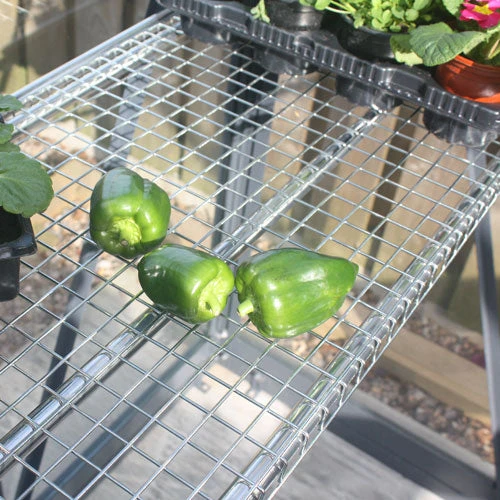 Both staging & shelving have a surface of 12 gauge / 1in square galvanised steel mesh, allowing excellent air circulation around the plants, so heat can rise & any surplus water can drain away quickly.